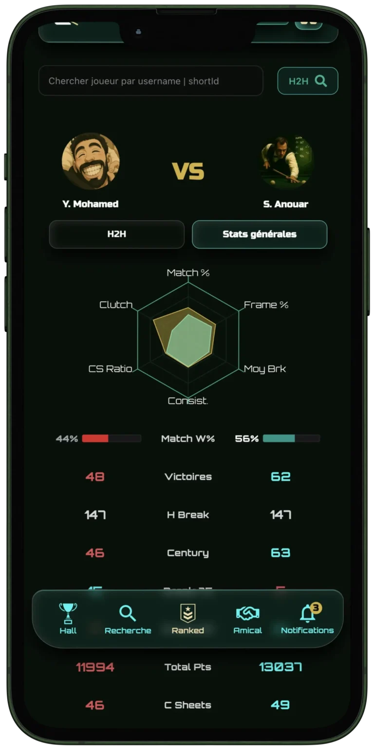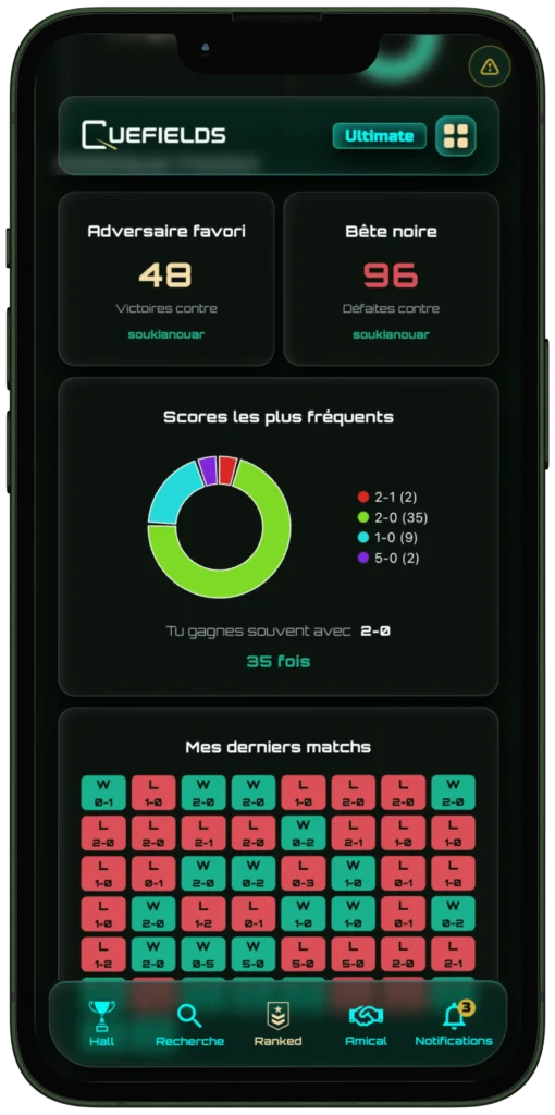 Le Dashboard CueFields, c’est ton quartier général. Un espace personnel élégant et immersif où tout ce qui te concerne en tant que joueur est visible, suivi et mis en valeur. Tu y retrouves l’historique complet de tes matchs, l’évolution de ton SPR, tes meilleurs breaks, ta ligue actuelle, tes badges débloqués, et même ton style de jeu dominant. En un clin d’œil, tu sais où tu en es, ce que tu as accompli, et ce qu’il te reste à conquérir. Plus qu’un simple tableau de bord, c’est une vitrine de ta progression, un outil de motivation et une passerelle vers le niveau supérieur.