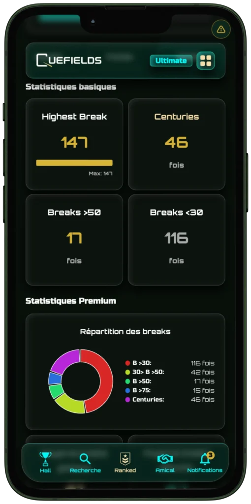 CueFields enregistre ton highest break personnel, ta moyenne de breaks par match ou par session, ainsi que ton nombre de breaks supérieurs à 20 / 30 / 50 et centuries.