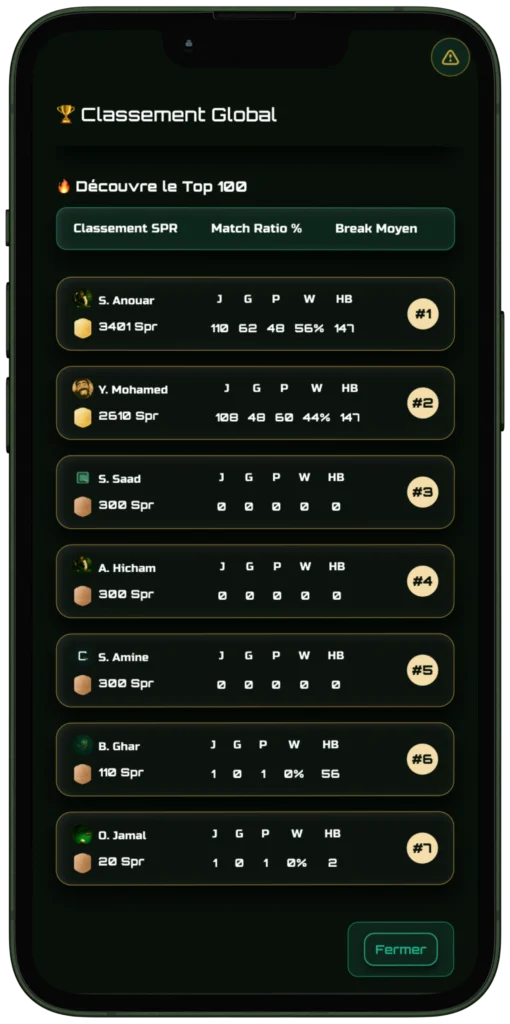 Chaque match classé compte. CueFields calcule automatiquement ton SPR (Score de Performance Réel) en fonction de ta performance, ton adversaire, et tes résultats récents. Grâce à ce système unique, tu évolues dans une ligue dynamique : Newcomers, Competitors, Masters ou Legends.