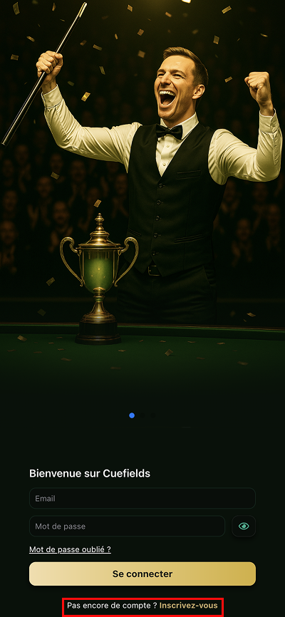 - Rendez-vous sur snooker.cuefields.com (ou scanne le QR code sur nos flyers/roll-ups).